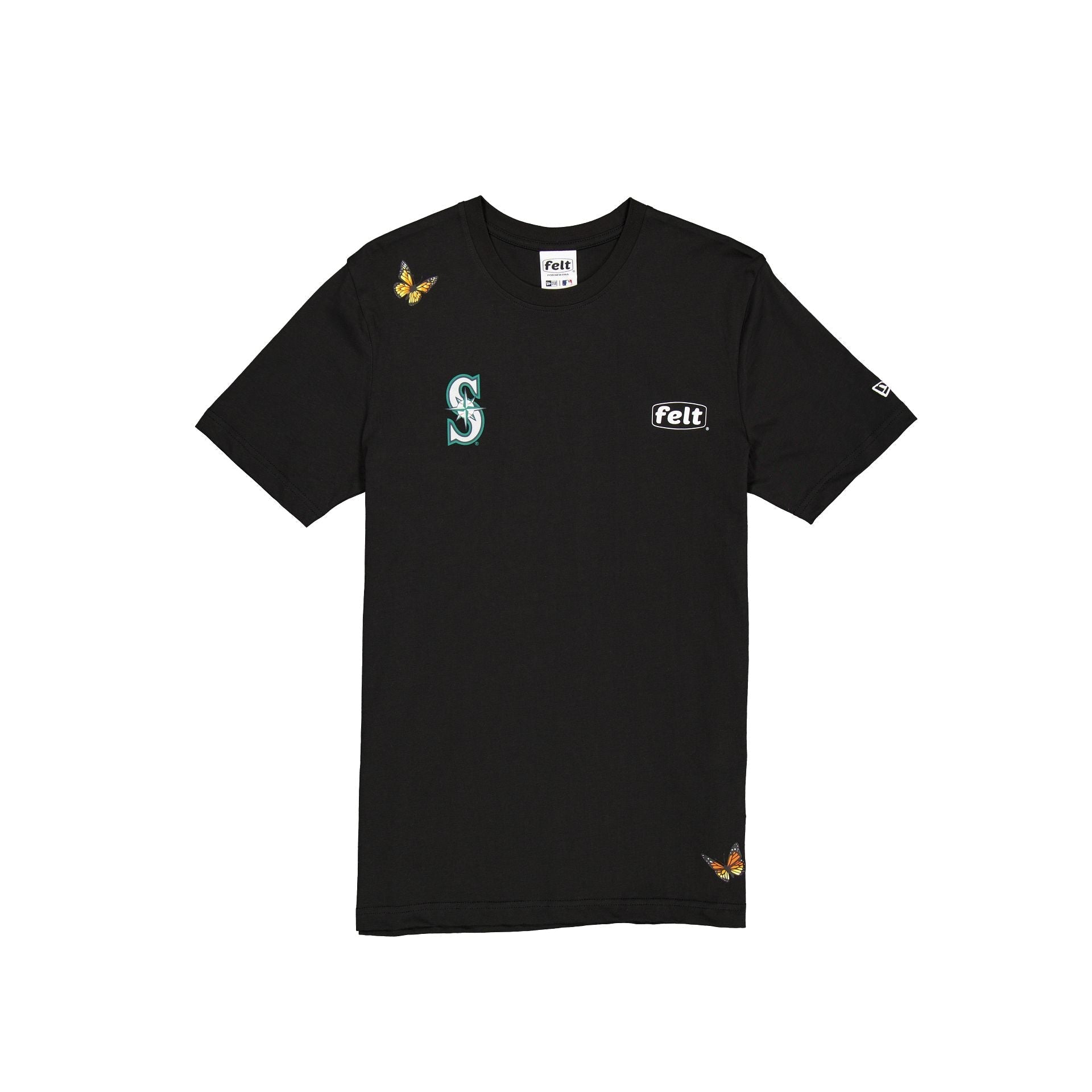 The FELT x Seattle Mariners Black T-Shirt features a screen-printed Mariners logo at the right chest and a FELT logo at the left chest with butterflies throughout.