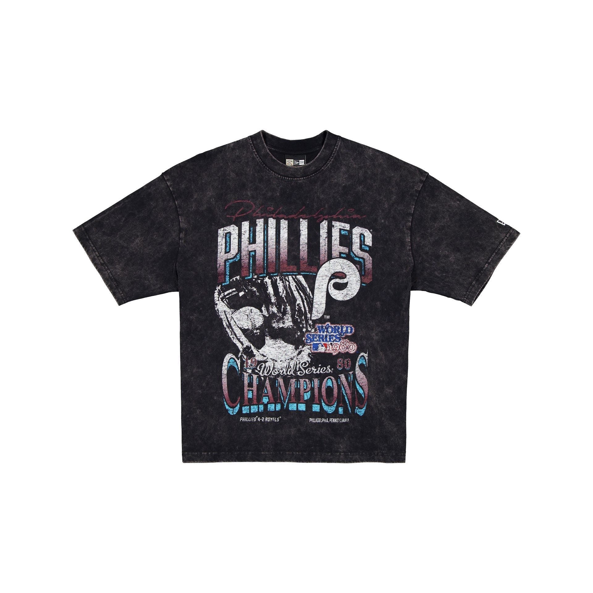 The Philadelphia Phillies 1980 World Series Champions Sport Classics Black T-Shirt features a screen-printed Phillies Champions graphic at the front.