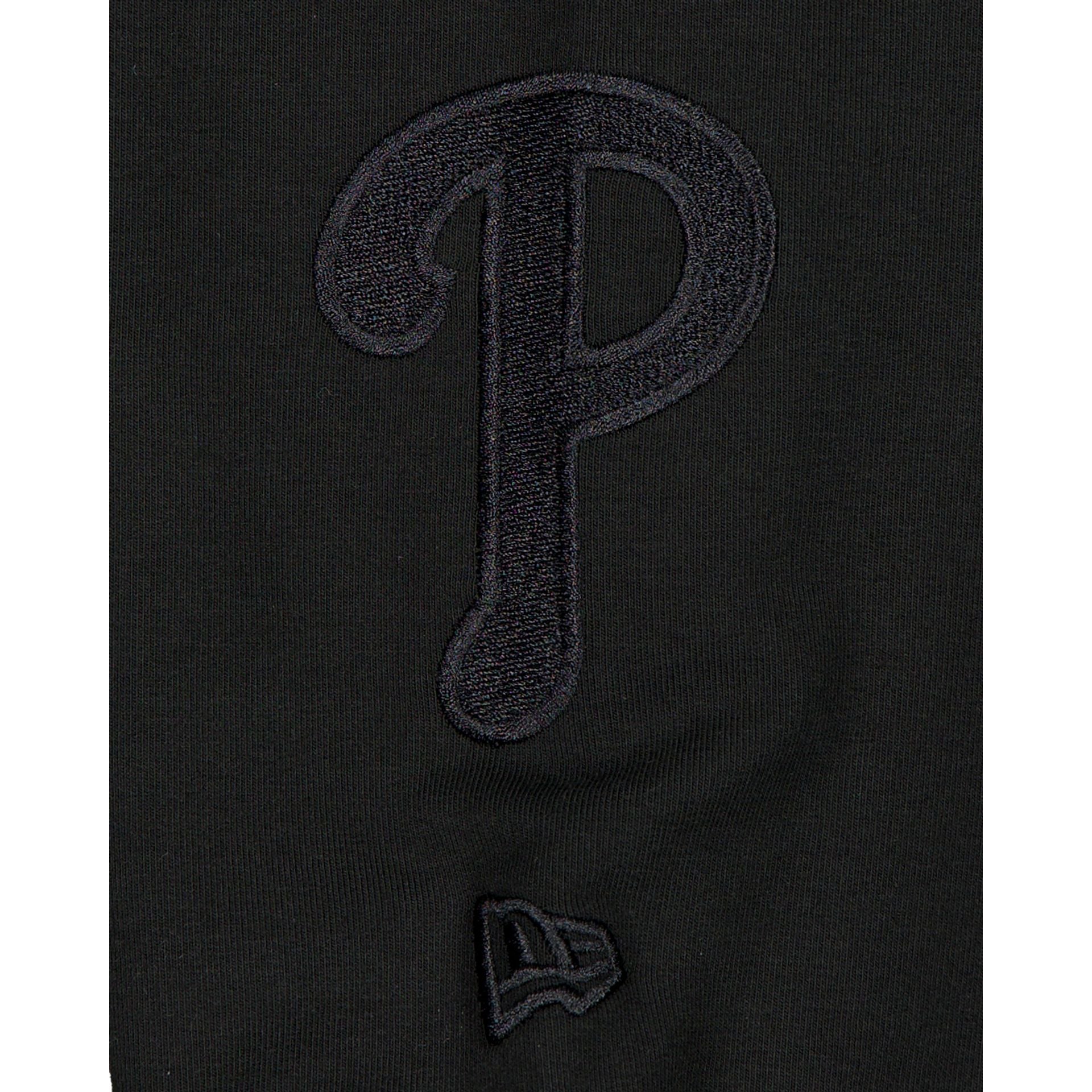 The Philadelphia Phillies Black on Black Logo Select Hoodie features a satin applique with a tonal stitch Phillies wordmark at the chest and an embroidered team logo at the left-wear sleeve.