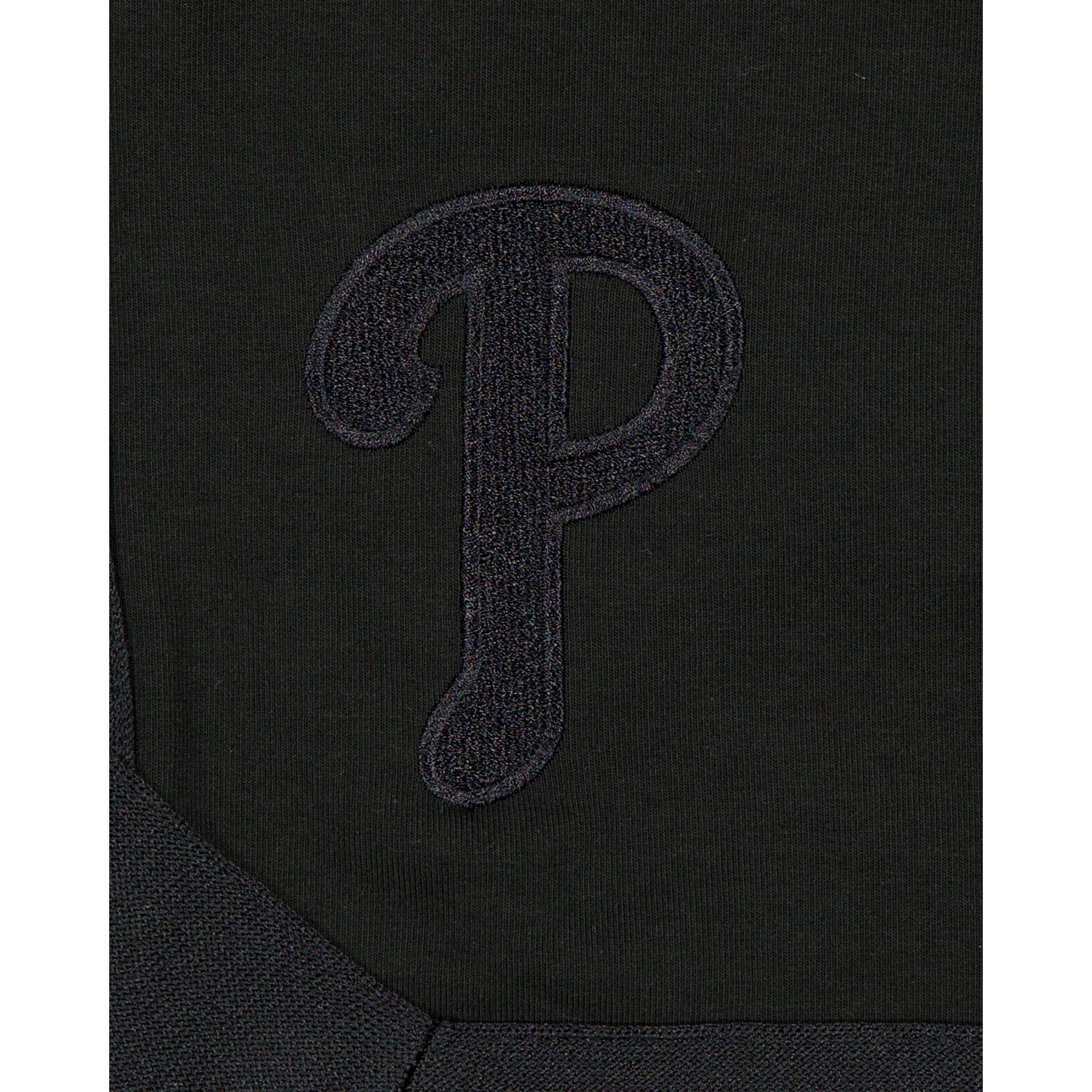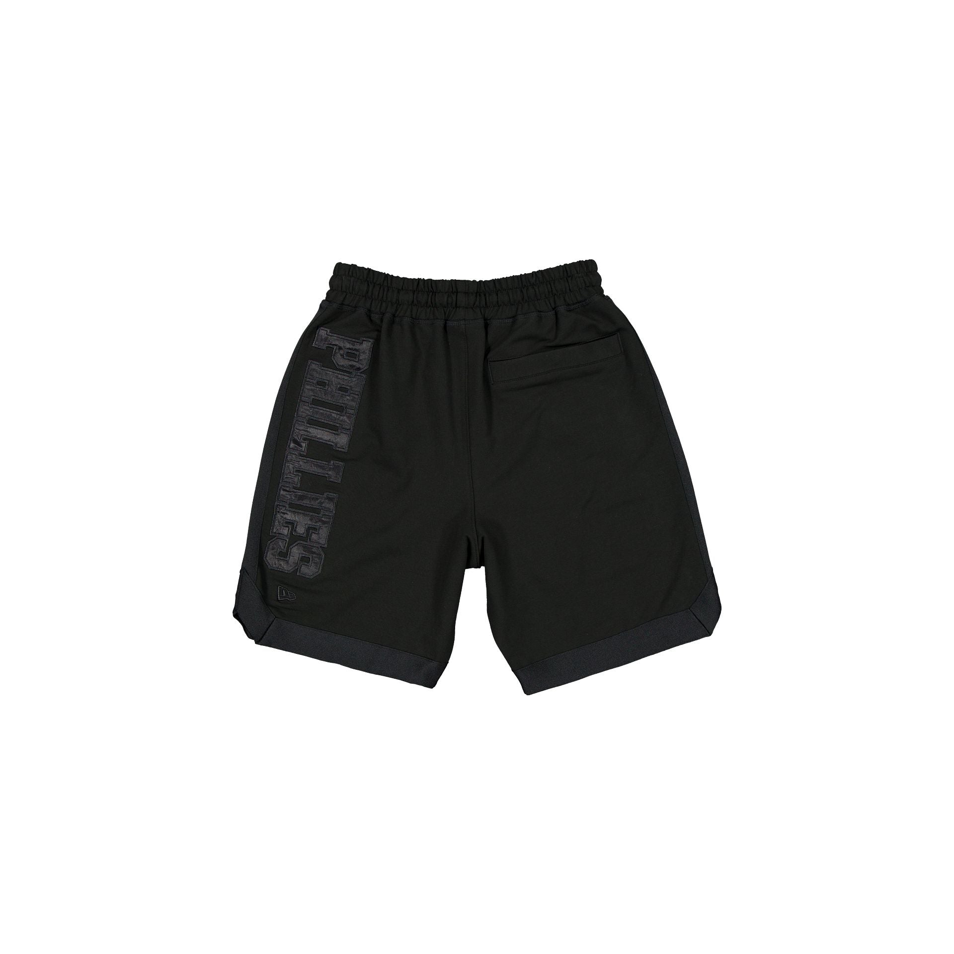 The Philadelphia Phillies Black on Black Logo Select Shorts features an embroidered Phillies logo at the right-wear leg and a satin applique with a tonal stitch team wordmark at the rear left leg.