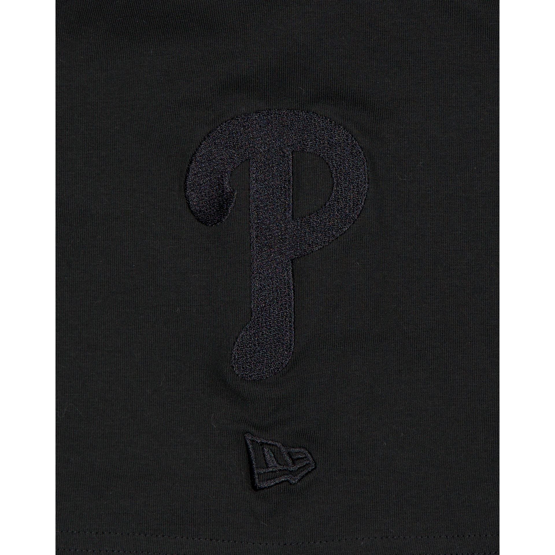 The Philadelphia Phillies Black on Black Logo Select T-Shirt features a satin applique with a tonal stitch Phillies wordmark at the chest and an embroidered team logo at the left-wear sleeve.