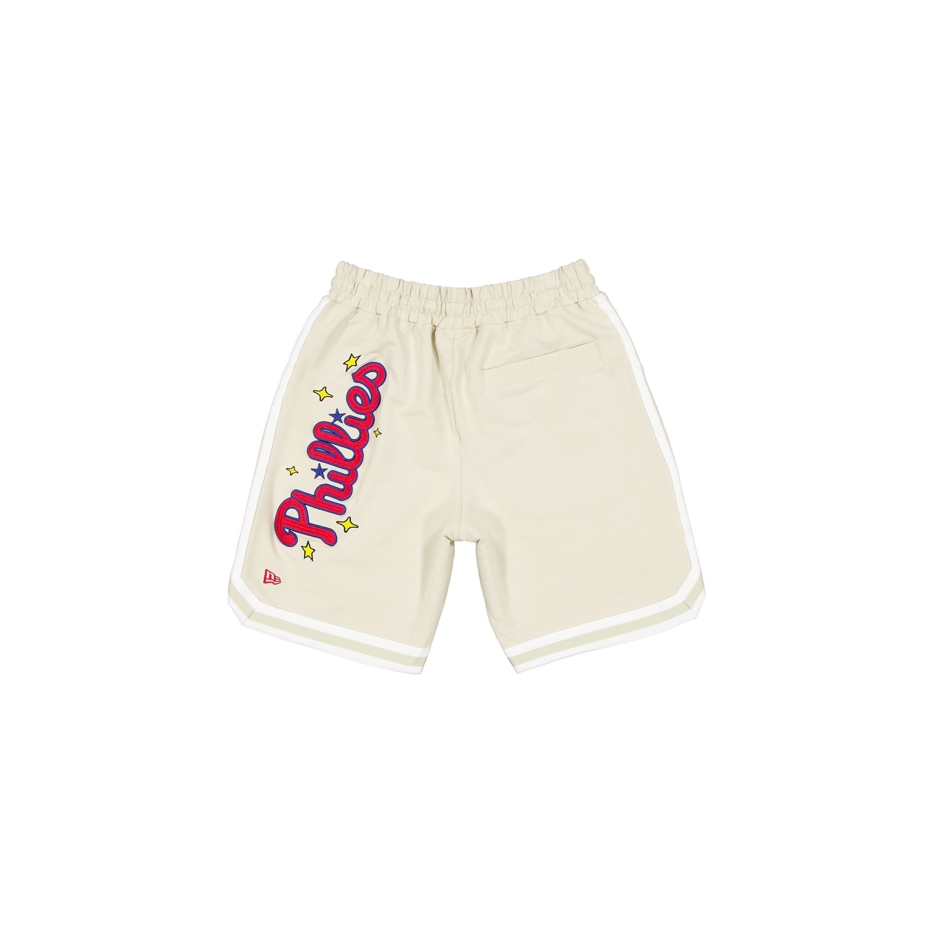 The Philadelphia Phillies Stone Logo Select Shorts feature an embroidered chenille applique Phillies logo at the left leg with embroidered team cap and patch at the right leg. Additional details include pockets and adjustable drawstrings and an embroidered team wordmark at the rear left leg.