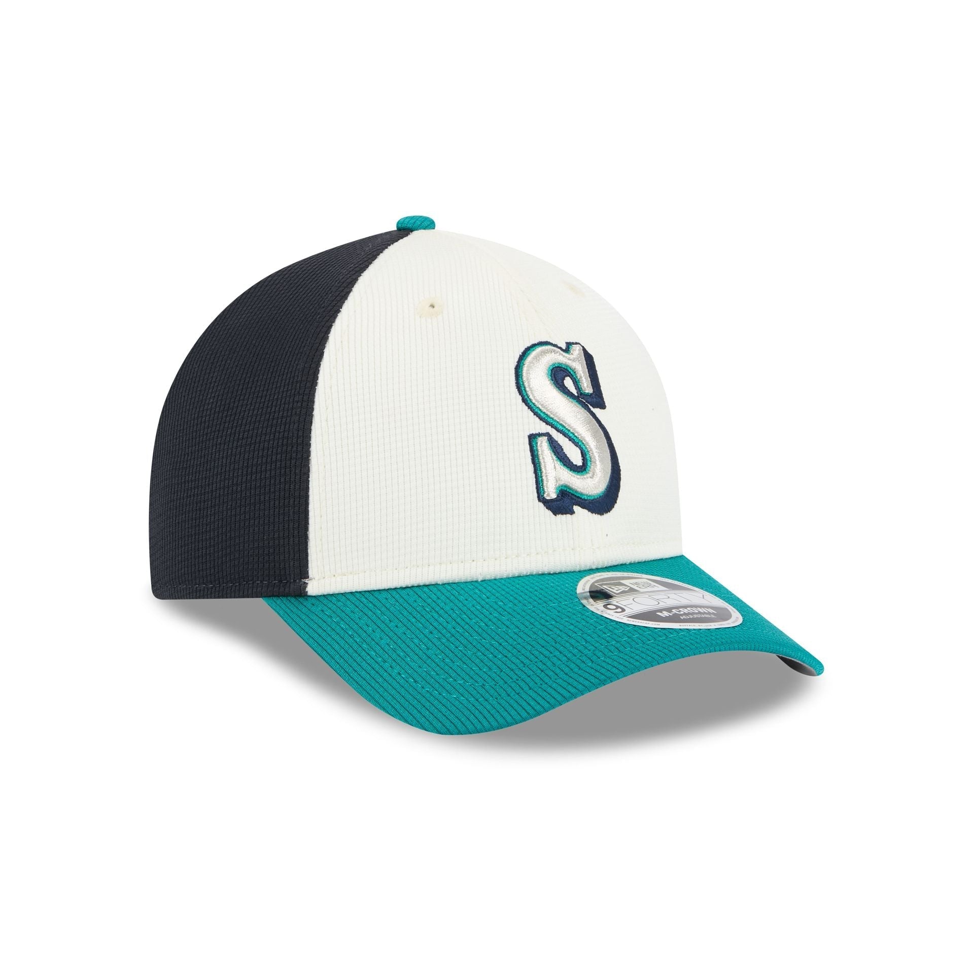 The Seattle Mariners 2025 Batting Practice 9FORTY M-Crown Snapback features an embroidered Mariners logo at the front panels with a snapback closure at the rear and a gray undervisor.