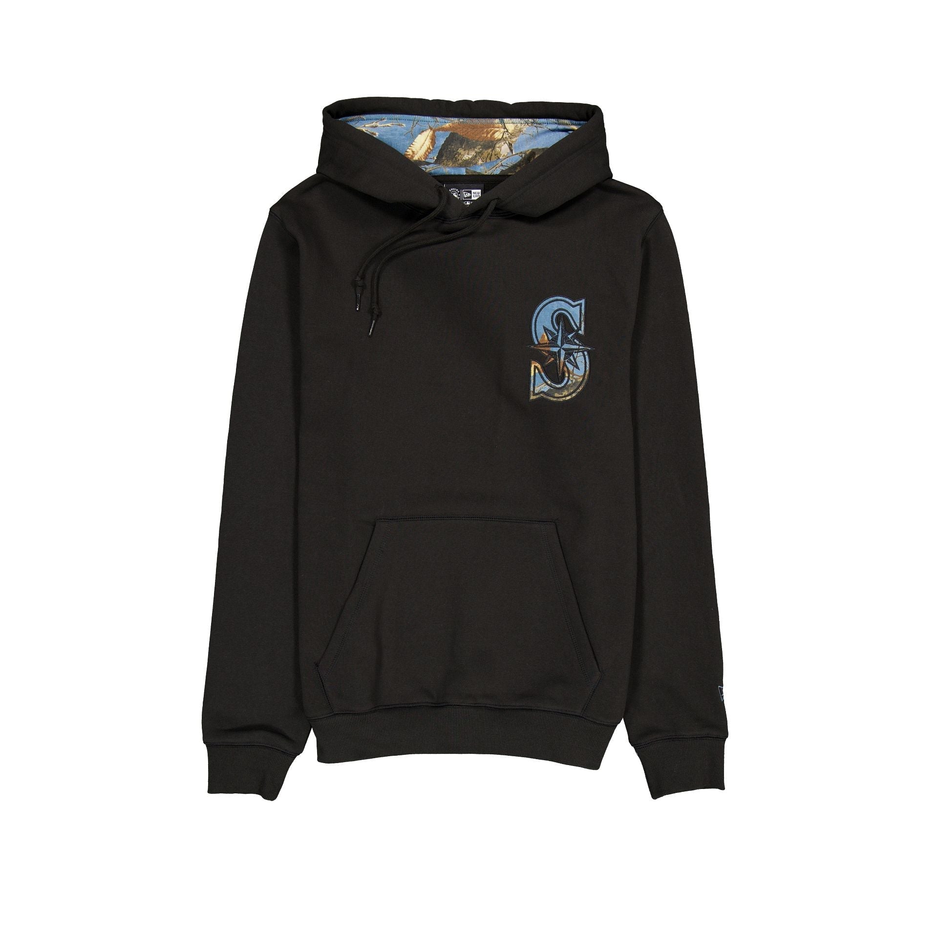 The Seattle Mariners Black Realtree Hoodie features an embroidered Mariners reflective ink Realtree applique with kangaroo pockets, blue Realtree lining, and a team wordmark at the hood.