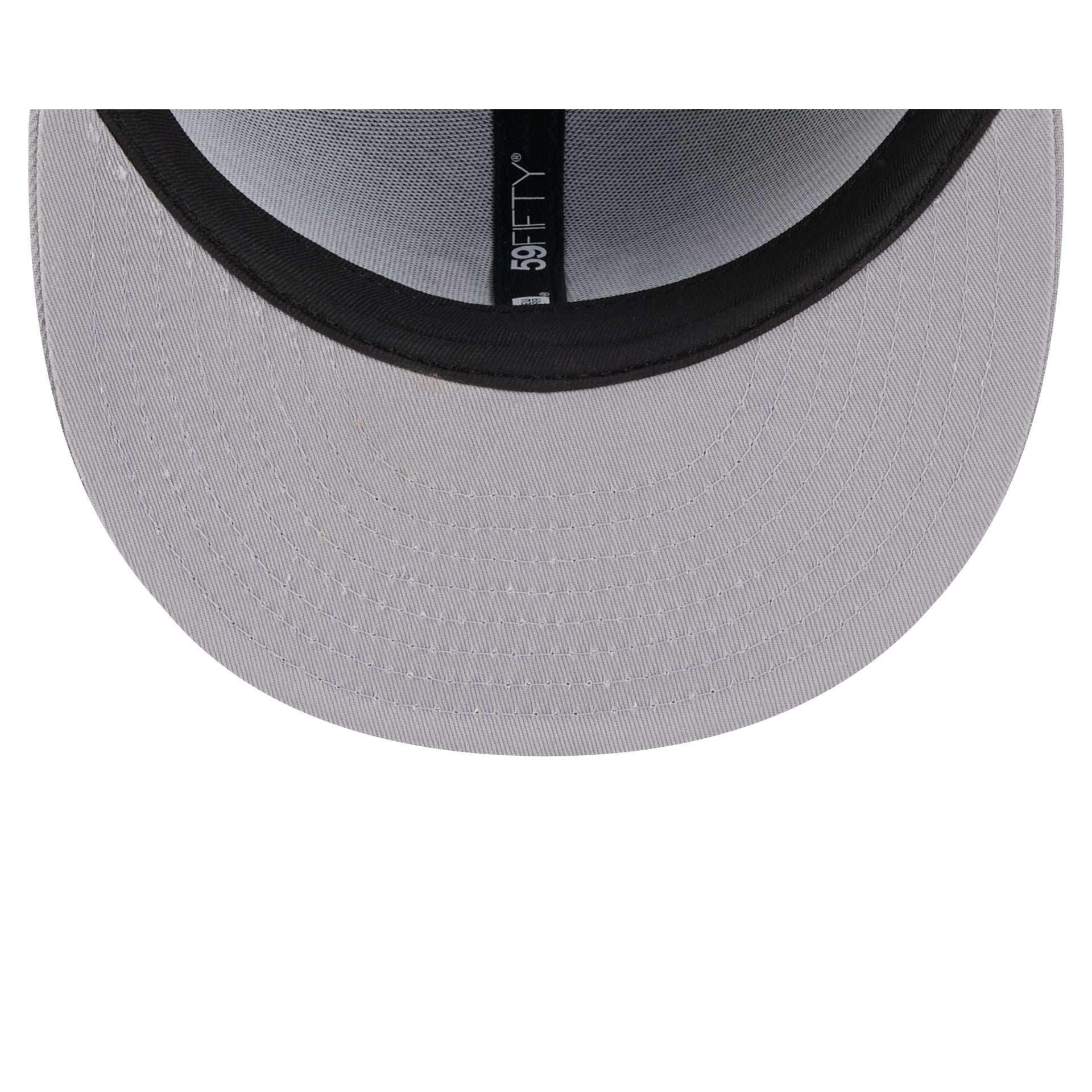 The Seattle Mariners Pinstripe League Pin 59FIFTY Fitted Cap features an embroidered Mariners logo at the front panels with a League pin at the front right panel. Additional details include pinstripes, a matching MLB Batterman logo at the rear, and a gray undervisor.