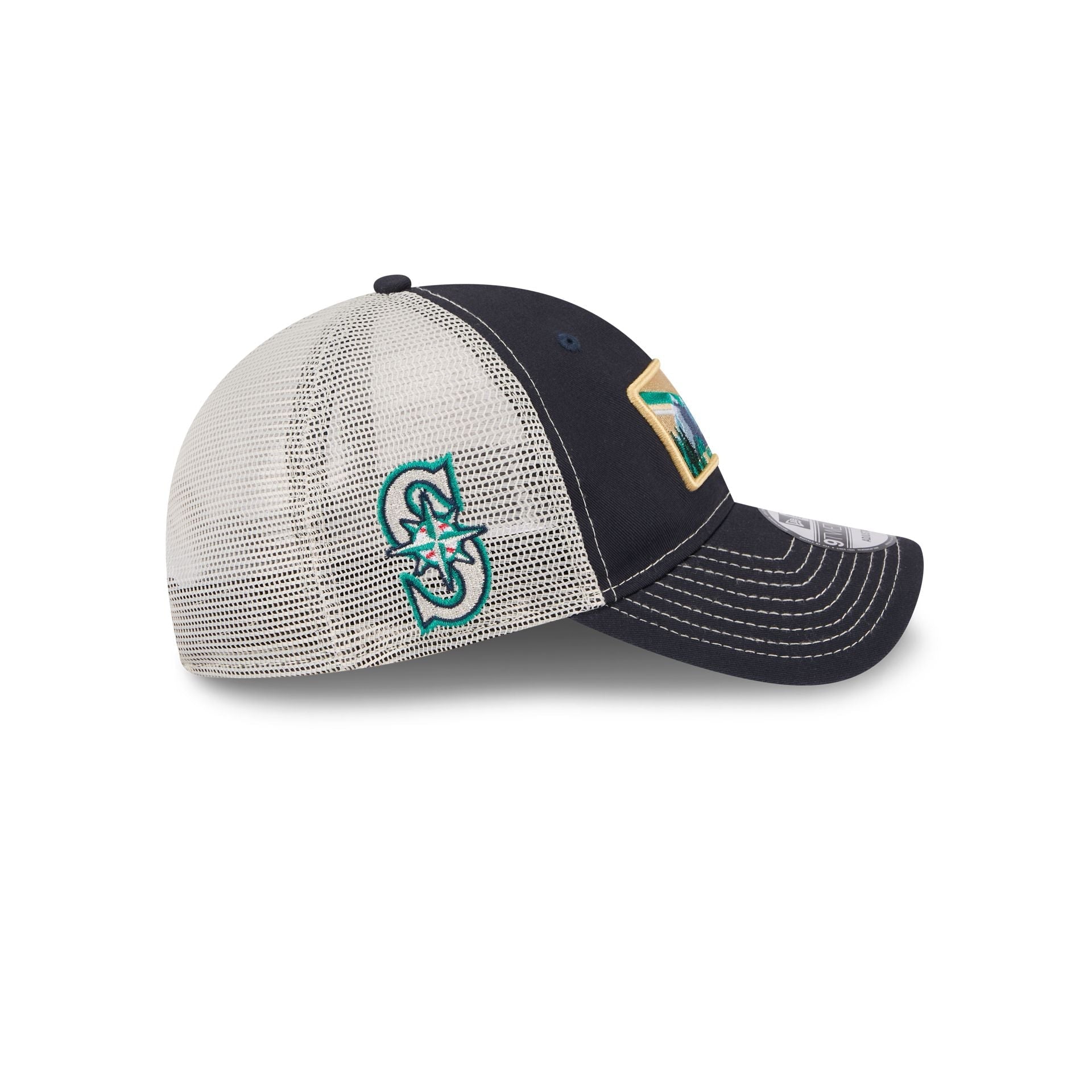 The Seattle Mariners State Souvenir 9TWENTY Trucker features an embroidered Mariners state inspired patch at the front panels with a team logo at the right-wear side, a gray undervisor, and an adjustable D-Ring closure at the rear.