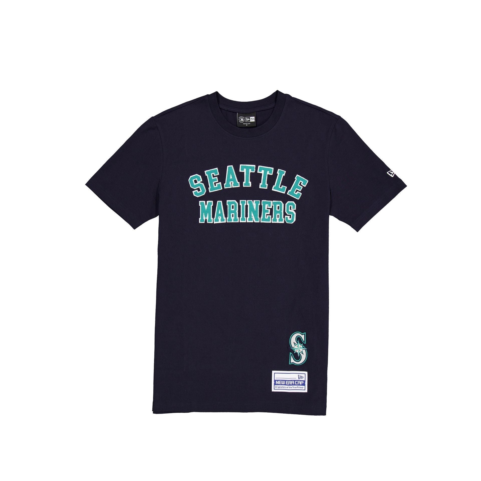 The Seattle Mariners Team Color Logo Select T-Shirt features a zig zag stitched twill applique Mariners wordmark at the chest with an embroidered team logo above a New Era Cap jock tag at the left hip.