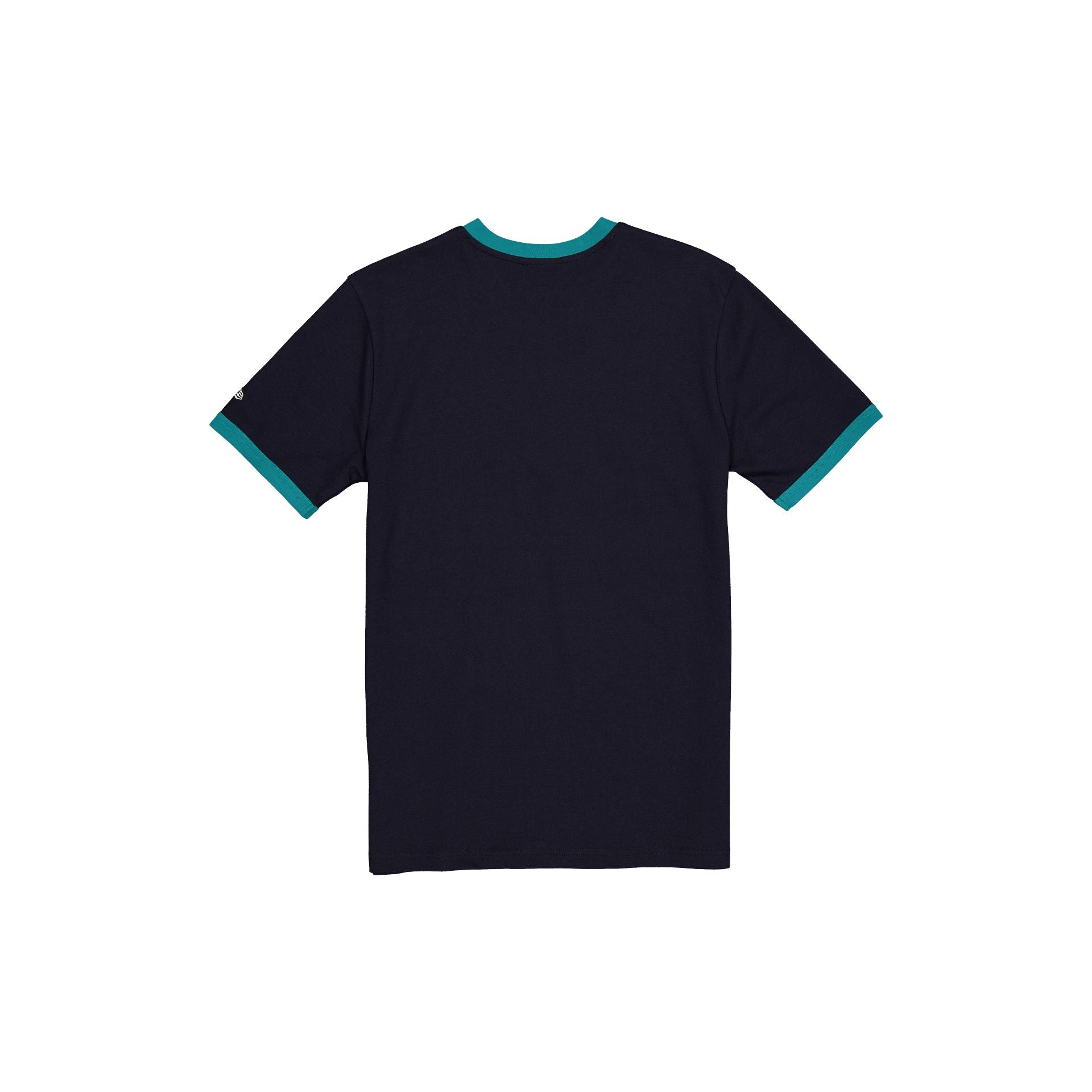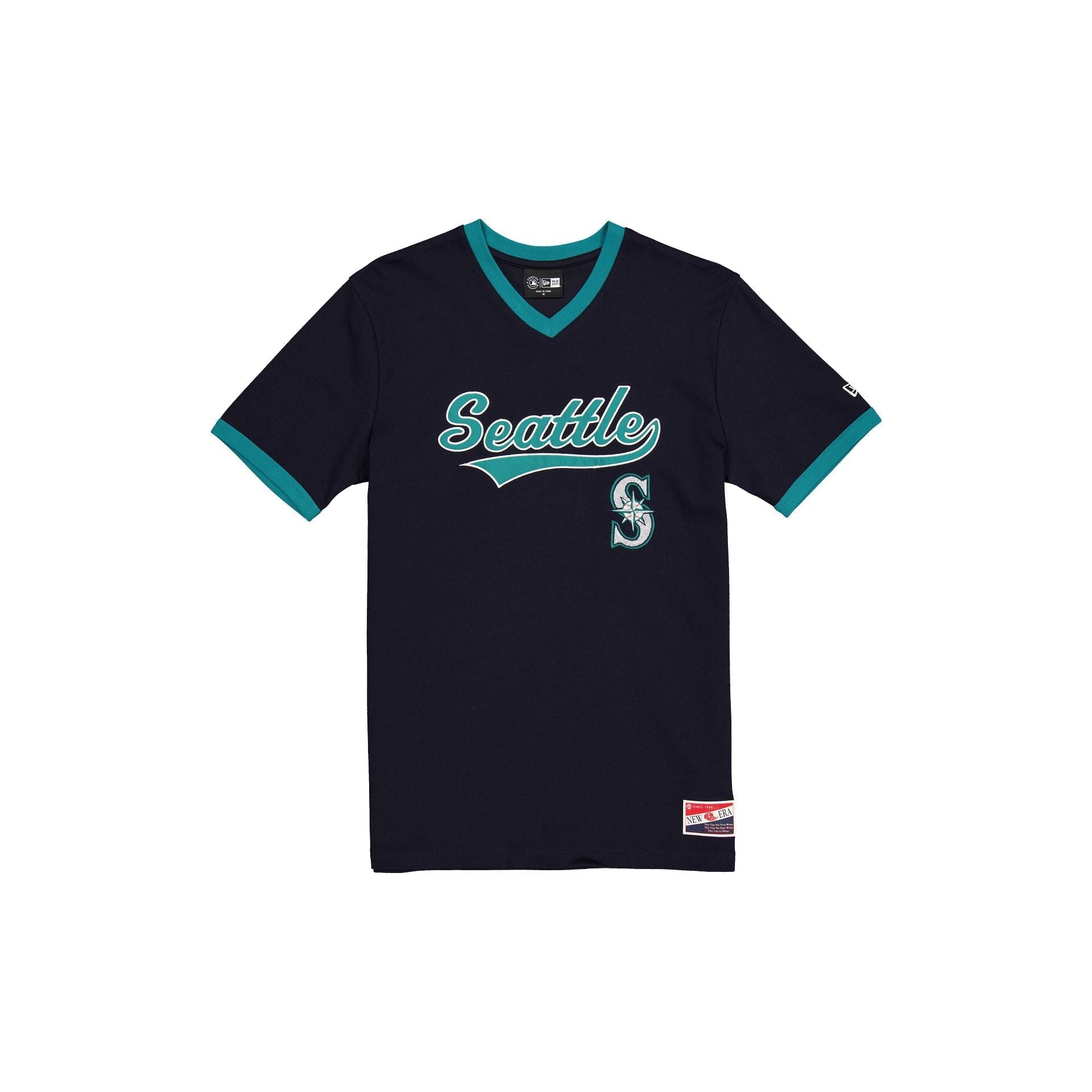 The Seattle Mariners Throwback Team T-Shirt features a screen-printed Mariners wordmark and embroidered team logo at the front with a New Era jock tag at the left hip. This t-shirt has a v-neckline.