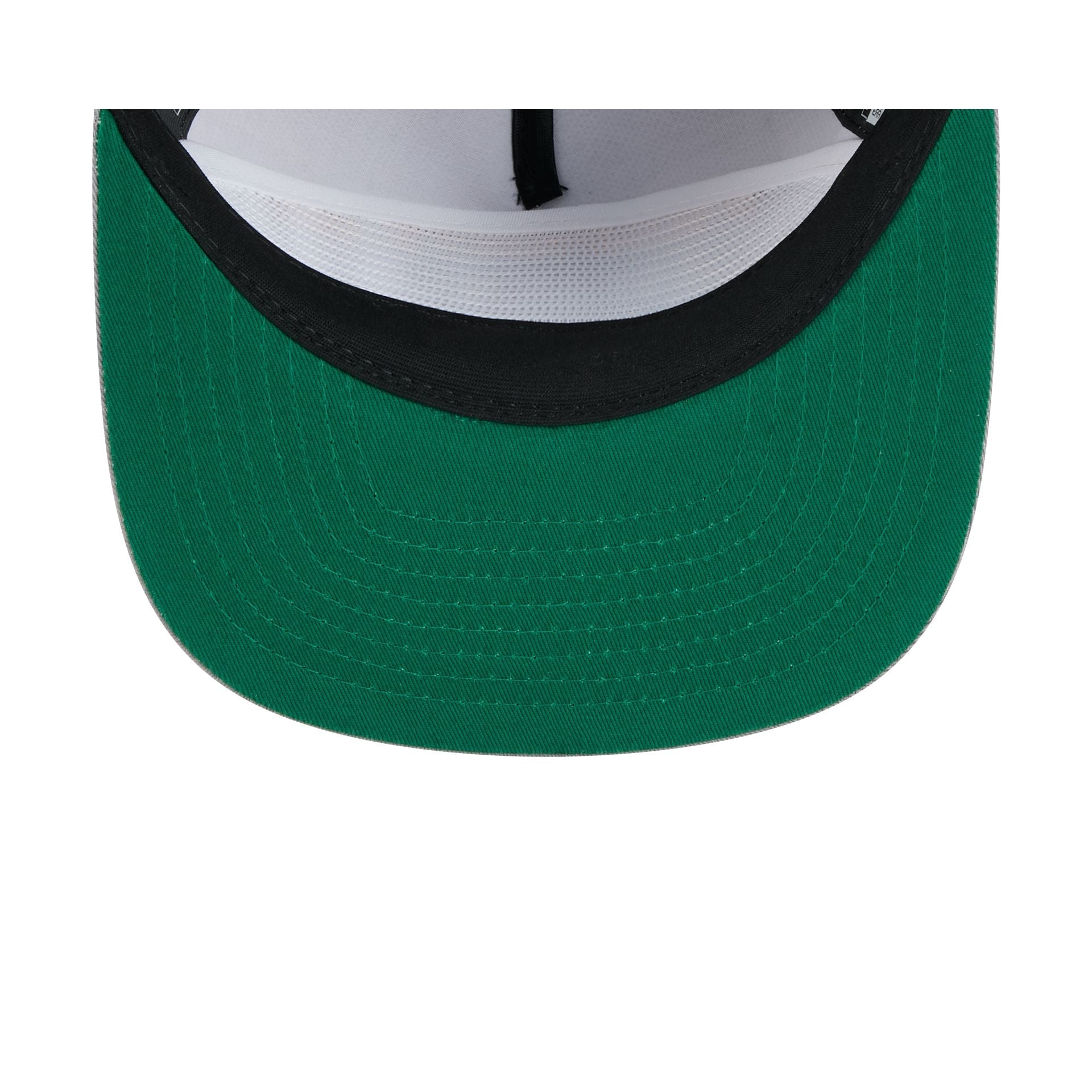 The Seattle Mariners Vintage Gray Golfer features an embroidered "PROPERTY OF" Mariners wordmark at the front panels with a team logo at the right-wear side and a rope at the visor. Additional details include a snapback closure at the rear and a green undervisor.